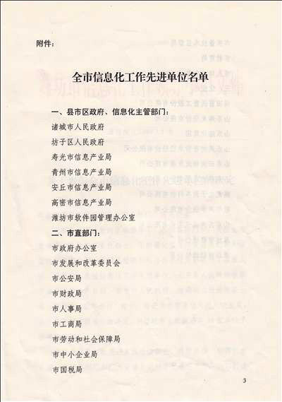 2月23日下午,全市信息化工作會議在市級機關綜合辦公大樓召開。本次會議對2008年度濰坊市信息化工作先進單位、優(yōu)秀政務網(wǎng)站和網(wǎng)站建設先進工作者進行表彰。我公司榮獲“全市信息化工作先進單位”光榮稱號。
